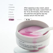 Tips: Place the tapered end under the inner corner to target fine lines, or under the outer corner to target eye bags and dark circles. For an extra refreshing effect, store the eye patches in the fridge.